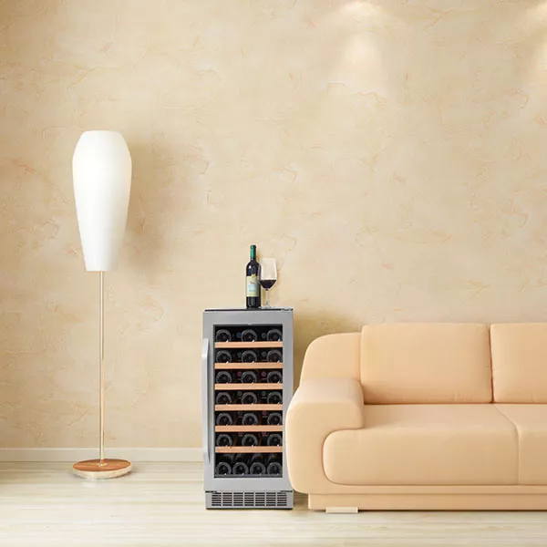 מדפי העץ הנשלפים מקנים למקרר היין מימד נוסף של יופי ויוקרה.